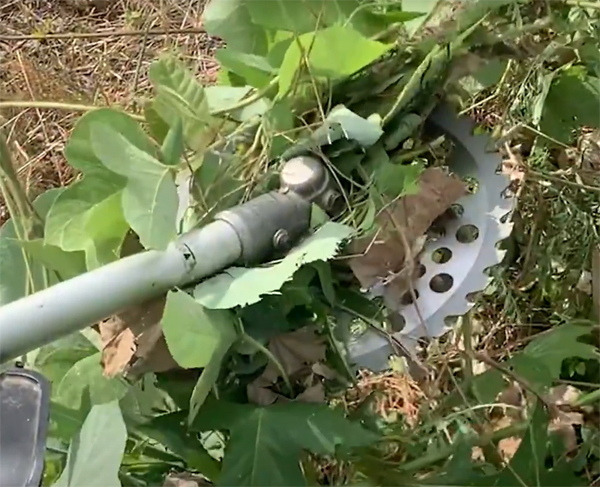 刈払い機で刈ろうとすると、つる草が巻き付いて回転がストップしてしまいます。