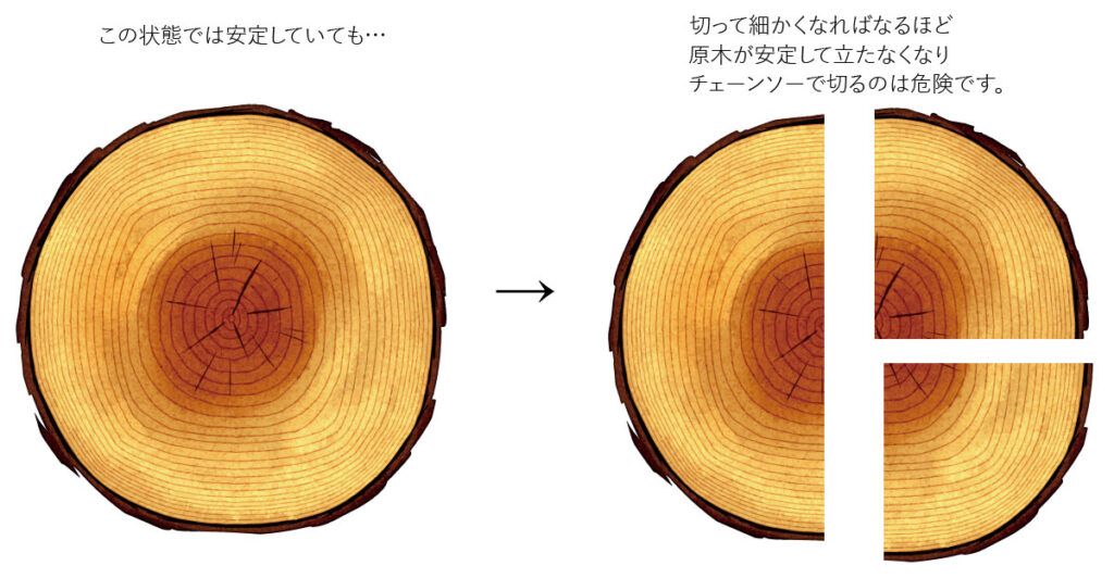 では、チェーンソーで原木を縦に切れば