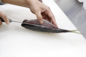 → 骨に沿って、出刃の切っ先を使いながら丁寧に身を切り分けていく。