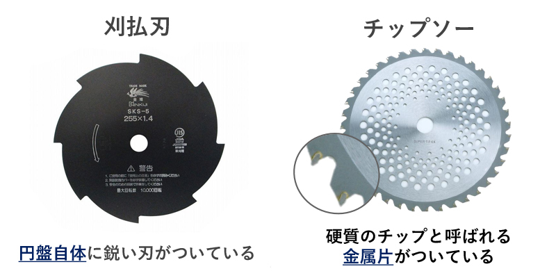 主に、刈払刃とチップソーの違いは、上記の画像の通りです。
