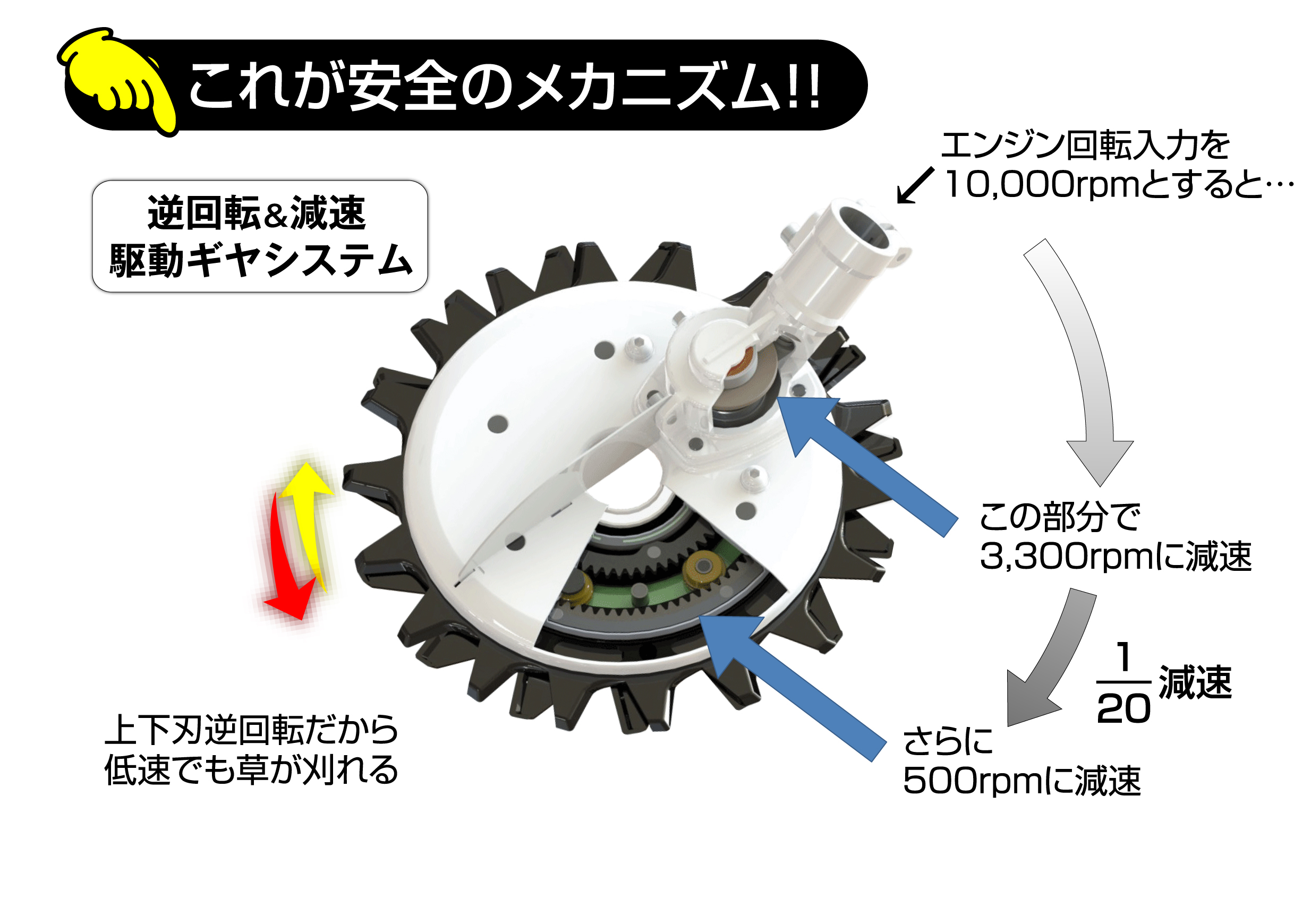 この減速機構と上下刃の逆方向回転駆動により、低速回転でも効率よく草が刈れ、石などの飛散を抑制できます。