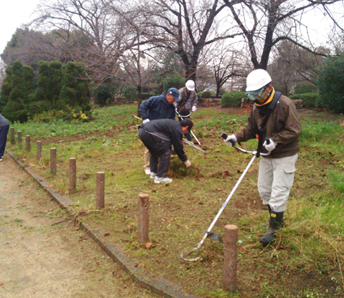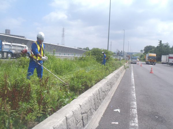 人のいる公園や通行車輌の多い道路、建物まわりのような、従来の高速刃では危険な場所でも安全に効率よく作業ができます。