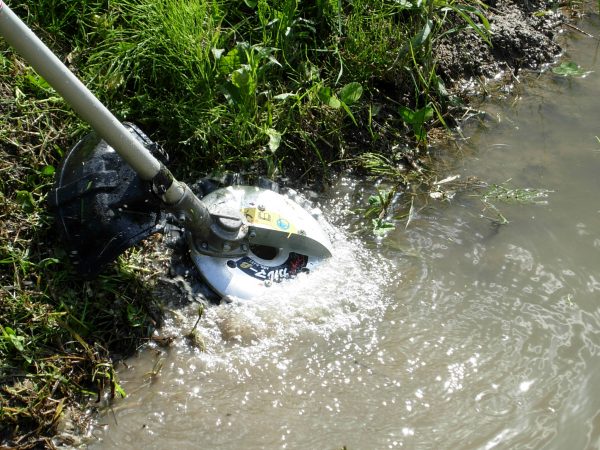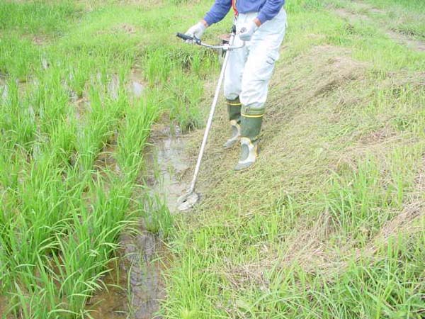上下低速回転ハサミ刈り方式と簡易防水構造の実現で一枚刃と比べて水面への吸い込みやハネ返りがなく、水田のあぜ等の水際でも安全に草刈りができます。