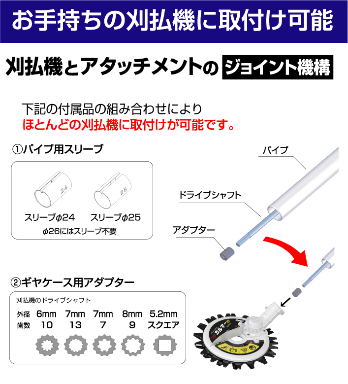 ほとんどの刈払機に取り付け可能です。