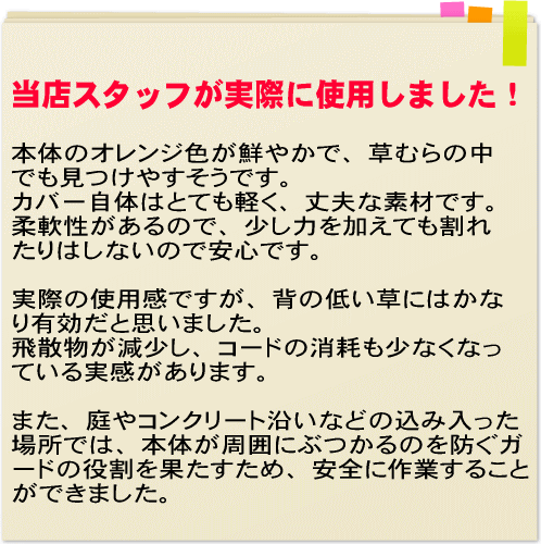 ビデオを見て「ほんとにそこまで切れるの?」って使ってみたら本当でした。おまけに,今までナイロンカッターを使うと作業服が草だらけになっていたのに,あまり汚れなくなって!これはお薦めです。