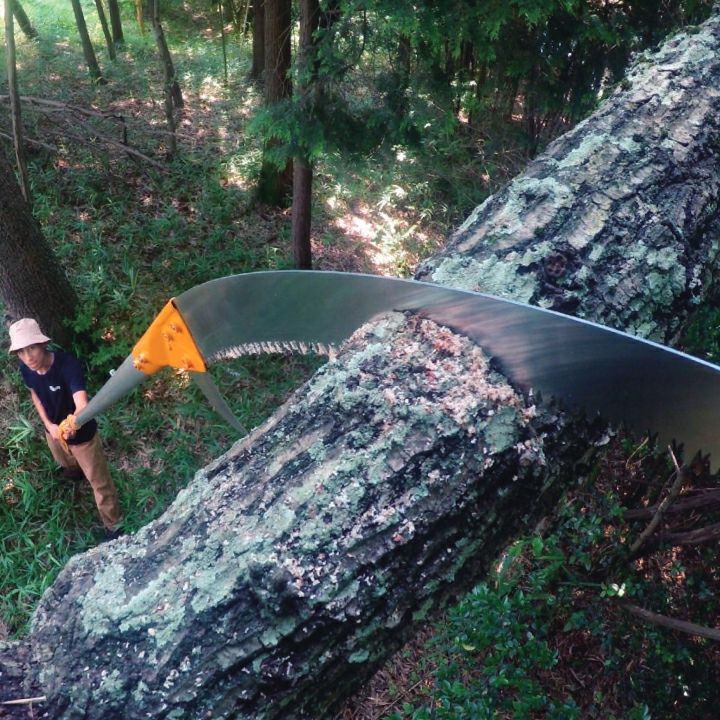高枝切り用鋸(高枝鋸)は、チェンソーが使用できない高い場所や枝切りバサミでは手に負えない太い枝を伐採するのに使用する道具です。