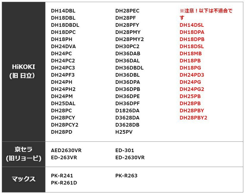 ■ SDSプラス軸 適合機種早見表 ハンマードリル ボッシュ GBH2-21GBH2-26GBH2-26DEGBH2-26DFRGBH2-26DREGBH2-28GBH2-28DFVGBH2-28DVGBH2-28FGBH3-28DREGBH4DFEGBH4-32DFRGBH18V-20 GBH18V-21GBH18V-21HGBH18V-26GBH18V-26DGBH18V-26FGBH18V-26FGDEGBH18V-26GDEGBH18V-34CFGBH18V-ECGBH18V-ECNGBH36V-LIGBH36V-LINGBH36V-LIN2 GBH36V-PLUSGBH36VF-LI GBH36VF-LIN GBH36VF-LIN2GBH36VF-PLUSGBH36VFHGBH36VFH-PLUSGBH36VHGBH36VH-PLUSGBH500SEPBH2100RE ヒルティ TE3-CTE3-MTE6-22TE6-A22TE6-A22-(04)TE6-A22-AVR TE6-A36TE6-A36-AVRTE7-ATE7-CTE16-CTE16-M TE30-22TE30-A36TE30-AVRTE30-M-AVRTE35TE40-AVR マキタ HK0500HK180DRGXHK180DZKHK1820HK1820LHR001GDXVBHR001GRDXHR001GRDXBHR001GRDXVHR001GZKHR001GZKBHR001GZKVHR007GRMXHR007GZKHR008GRMXHR008GRMXVHR008GZKHR008GZKVHR010GRDXHR010GRDXVHR010GZKHR010GZKVHR181DGXBHR181DGXVBHR181DRGXHR181DRGXB HR181DRGXVHR181DZKHR181DZKBHR181DZKVHR182DGXVBHR182DRGXHR182DRGXBHR182DRGXVHR182DZKHR182DZKBHR182DZKVHR200DRJSPHR202DRFXHR202DRGXHR202DZKHR242DRFXHR242DZKHR244DGXVBHR244DRGXHR244DRGXVHR244DRMXHR244DRMXVHR244DRTXHR244DRTXVHR244DZKHR244DZKV HR261DRDXHR261DZKHR262DRDXHR262DWBXHR262DZKHR263DPG2HR263DPT2HR263DRM2HR263DZKHR282DPG2HR282DPG2VHR282DZKHR282DZKVHR2432HR2450HR2450FHR2470FHR2611FHR2631FHR2651HR2811FHR3000CHR3011FCHR3011FCV HiKOKI(旧 日立) DH14DBLDH18DBLDH18DBDLDH18DPCDH18PHDH24DVADH24PCDH24PC2DH24PC3DH24PF3DH24PHDH24PH2DH24PMDH25DALDH28PCDH28PCYDH28PCY2DH28PD DH28PECDH28PFDH28PFYDH28PMYDH28PMY2DH30PC2DH36DABDH36DALDH36DBDLDH36DBLDH36DPADH36DPBDH36DPEDH36DPFD1826DAD3628DAD3628DBH25PV ※注意!以下は不適合ですDH14DSLDH18DPADH18DPBDH18DSLDH18MBDH18PBDH18PGDH24PD3DH24PGDH24PG2DH25PBDH28PBDH28PBYDH28PBY2 京セラ(旧リョービ) AED2630VRED-263VR ED-301ED-2630VR マックス PK-R241PK-R261D PK-R263