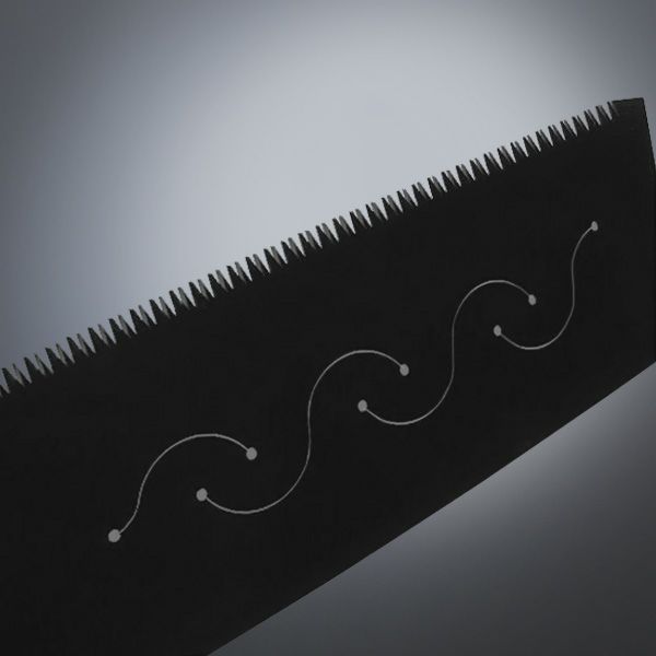 仮枠用鋸 特殊刃 手袋をつけて作業する際に大変便利なゴムグリップです。磨耗を防ぐため、刃先に衝撃焼入れを行い、永切れするように作られています。 商品一覧はこちら>> 高硬度(HRC60)で、厄介な材木でもスムーズによく切れて永切れします。ブラックフッ素コーティング処理を施していますので滑りがよくボンドやヤニが付きにくく作業効率が上がります。 商品一覧はこちら>>