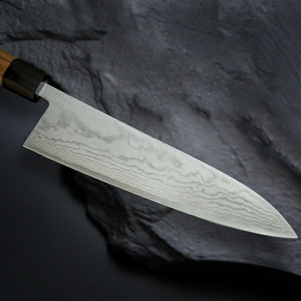 タガネ・レーザー名入れ可能 切刃に高硬度で耐摩耗性に優れた最高級のステンレス鋼であるV金10号を使用。片側16層の積層材を美しく磨き上げることで33層のダマスカス模様が浮かび上がります。 |