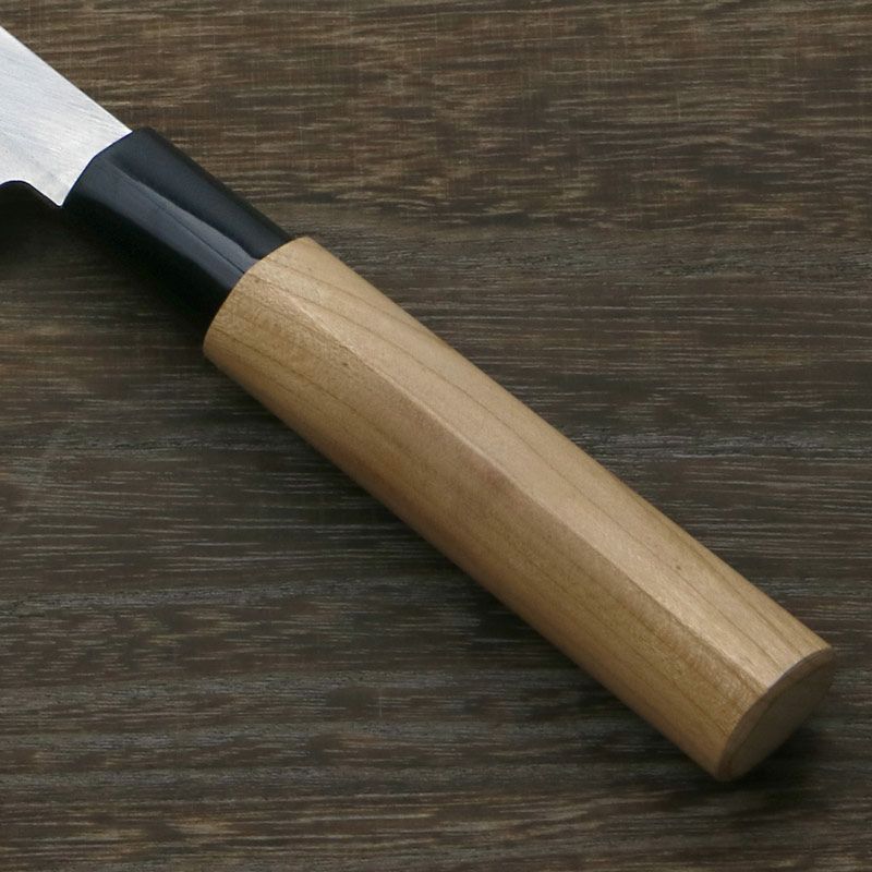 タガネ・レーザー名入れ可能 ステンレス包丁の中ではもっとも和包丁に適した銀紙三号を使用。炭素鋼並みの硬度と切れ味があるのにサビにくく、ご家庭での調理に最適です。柄は握りやすい丸しのぎで、お刺身が引きやすいです。 |