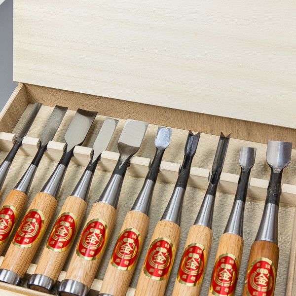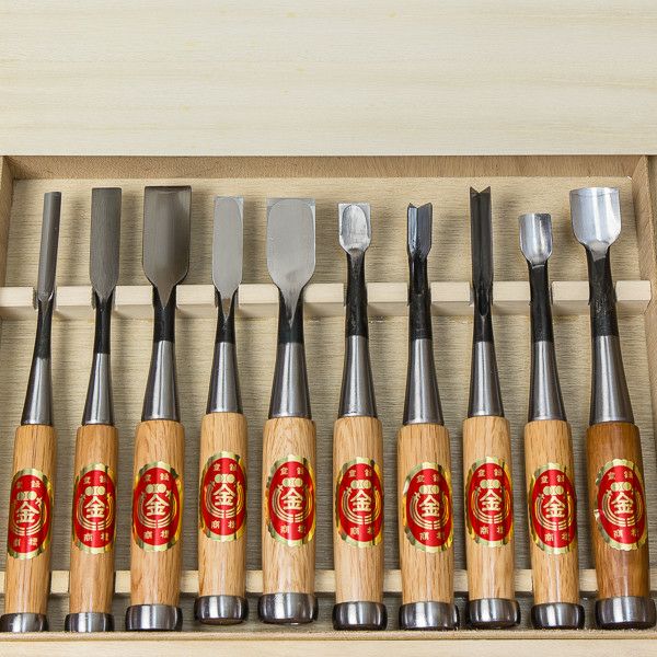 本職用 高級木彫りのみ 赤樫柄 白紙鋼 10本組 木箱入り